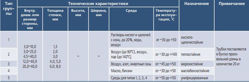 Предназначены для подачи по ним жидкостей, воздуха и газов с давлением не более 0,05 МПа (группа 2) или без избыточного давления (группа 1), могут применяться в различных отраслях промышленности. Кроме того, трубки могут применяться в качестве уплотняющих элементов неподвижных соединений.